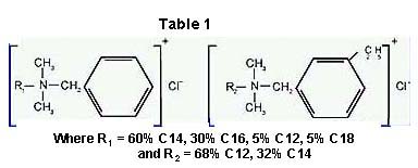 The dual quat system in this improved method of sanitization consists of a 50/50 mixture of N-Alkyl (60% C14, 30% C16, 5% C12, 5% C18) dimethyl benzyl ammonium chlorides and N-Alkyl (68% C12, 32% C14) dimethyl ethyl benzyl ammonium chlorides as the active ingredients of the surface sanitizing wiper. Chemical structures for the dual quat system are provided in Table 1. Inert ingredients include propylene glycol as the diluent along with a wetting agent and a Turquoise pigment. The diluent is required to insure uniform coating on the wiper and, ultimately, reliable release from the nonwoven substrate during use. The wetting agent works in concert with the propylene glycol, insuring that the sanitizing solution uniformly coats the irregularities of the surfaces to be sanitized. The additional wetting agent augments the surfactant effects of the higher molecular weight quats to insure the thorough wetting of hydrophobic surfaces made from polypropylene, polyethylene and polyester plastics.