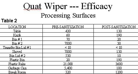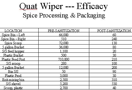 Testing of the effectiveness of the quat wiper on food contacting surfaces indicated that the concentration of the activated solution is effective in reducing microbial levels on food contacting surfaces. Table 2 summarizes the testing conducted to date on actual processing surfaces used in the production of spices and ready to eat food products. Results are reported as aerobic plate counts ( CFU --- colony forming units ) taken using sterile swabs from a 2 inch by 2 inch square area of each test surface. The sanitization process was accomplished by using the wiper to thoroughly wet the surface with the activated solution, which was allowed to remain in place for at least one minute. Following exposure, excess solution was wiped up and the surface was allowed to dry prior to swabbing with sterile swabs.