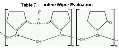 The PVP solution is mechanically applied using processes similar to those employed in the preparation of the quat wiper. The 5 % povidone-iodine solution is lightly applied onto the surface of the towel substrate. The 5 % PVP solution contains 0.5% active iodine. By controlling add-on weights, the resultant Iodine Wiper contains 750 + 250 ppm (0.075 + 0.025 %) iodine.