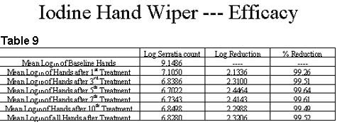 Review of the results of this testing indicates that the reductions in bacterial counts obtained through the use of the iodine wiper are similar to the reductions achieved through the use of iodine-based liquid hand wash preparations.